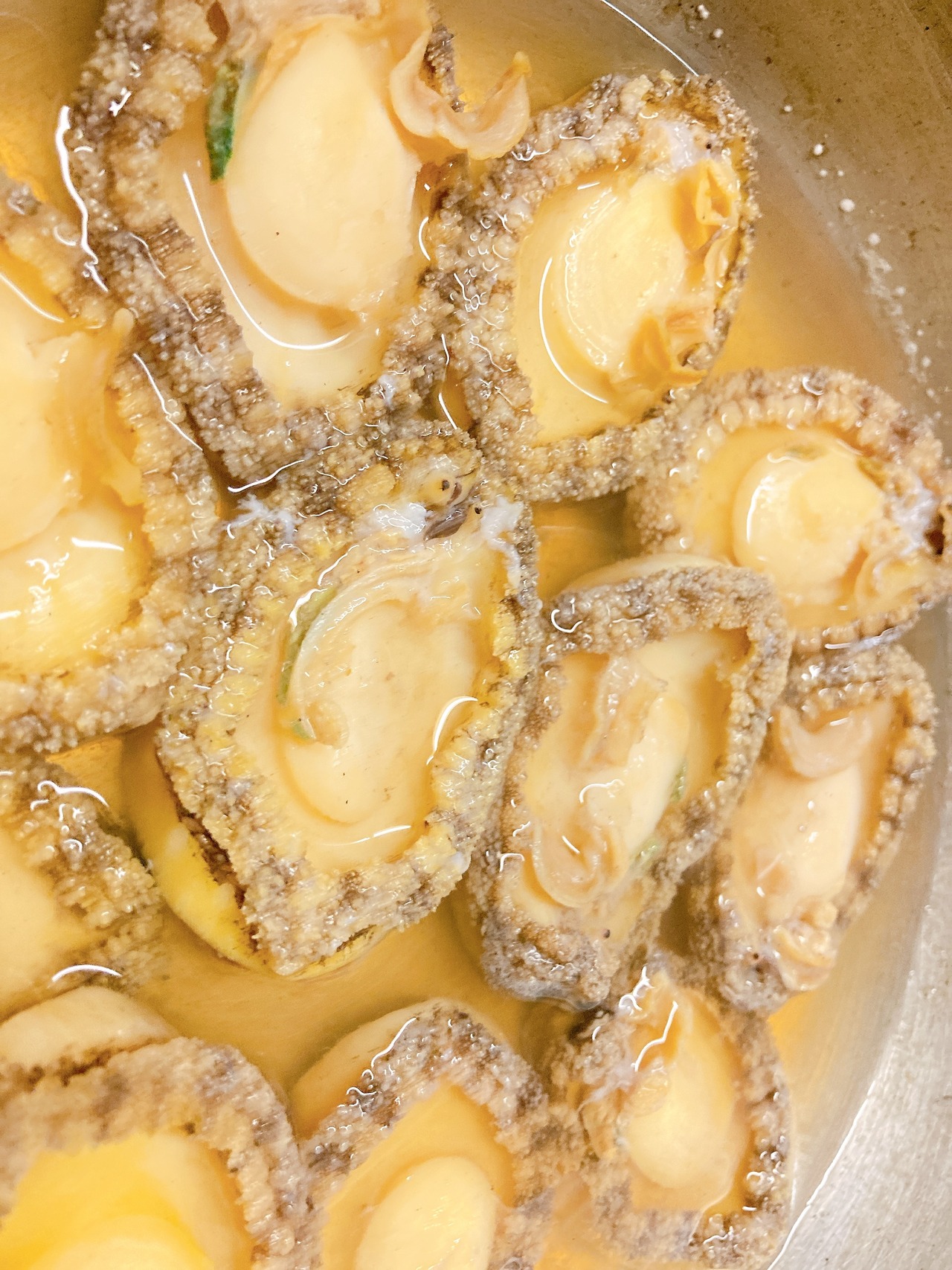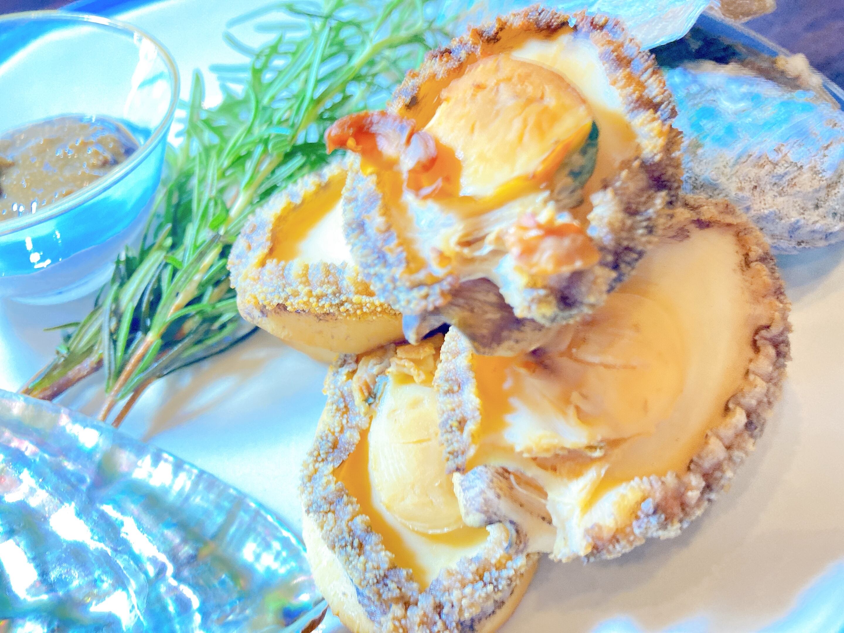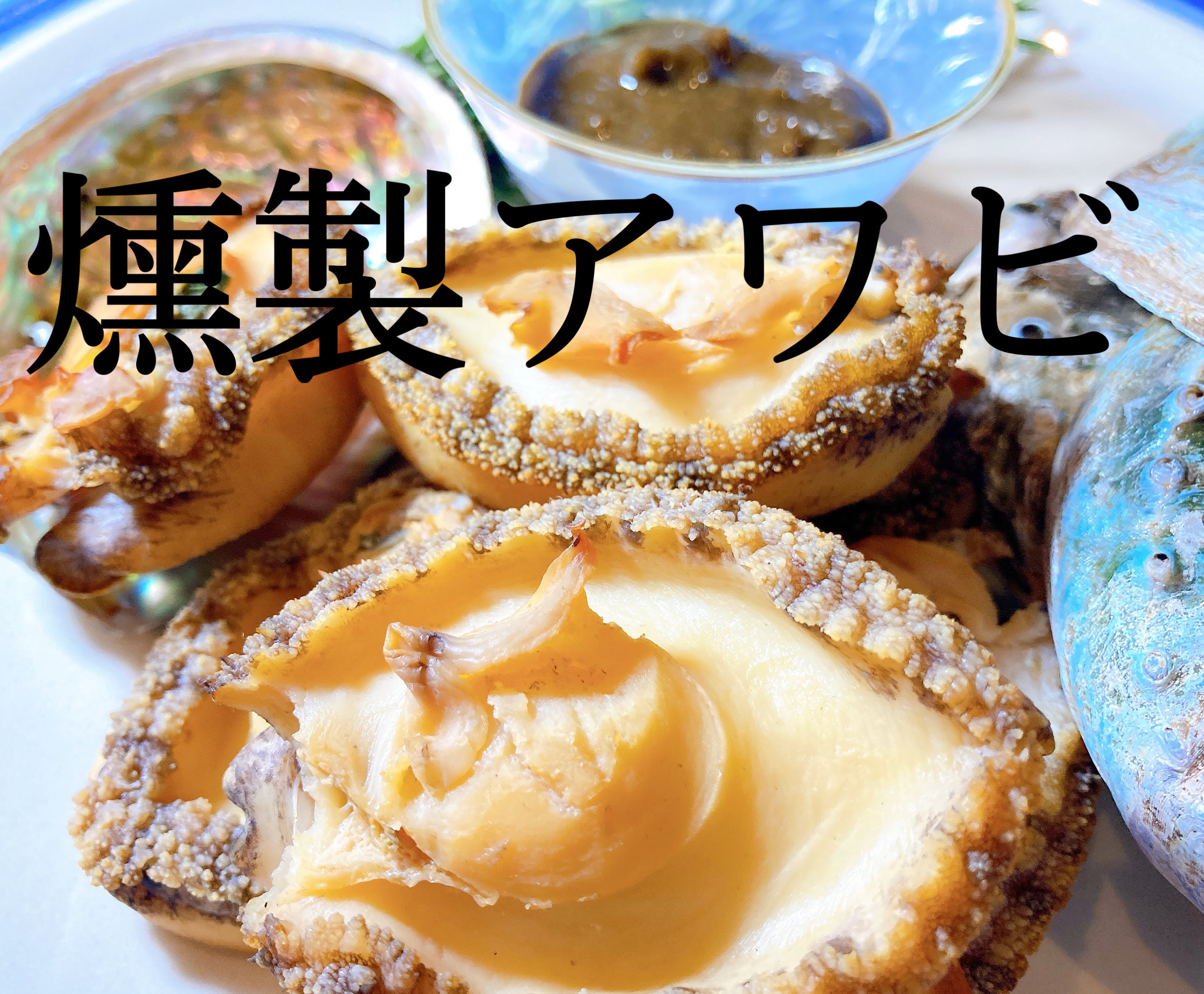 殻付きで、約100gのアワビを30gになるまで、凝縮させております。濃厚になり、燻製の薫りが乗ったアワビをお召し上がり下さい。
