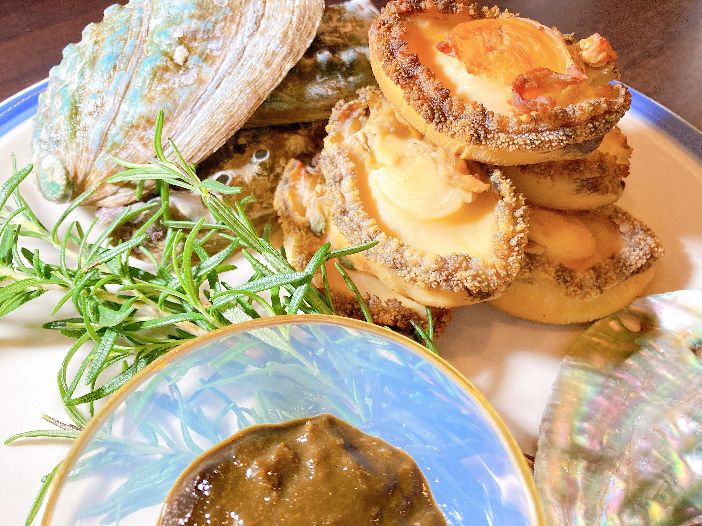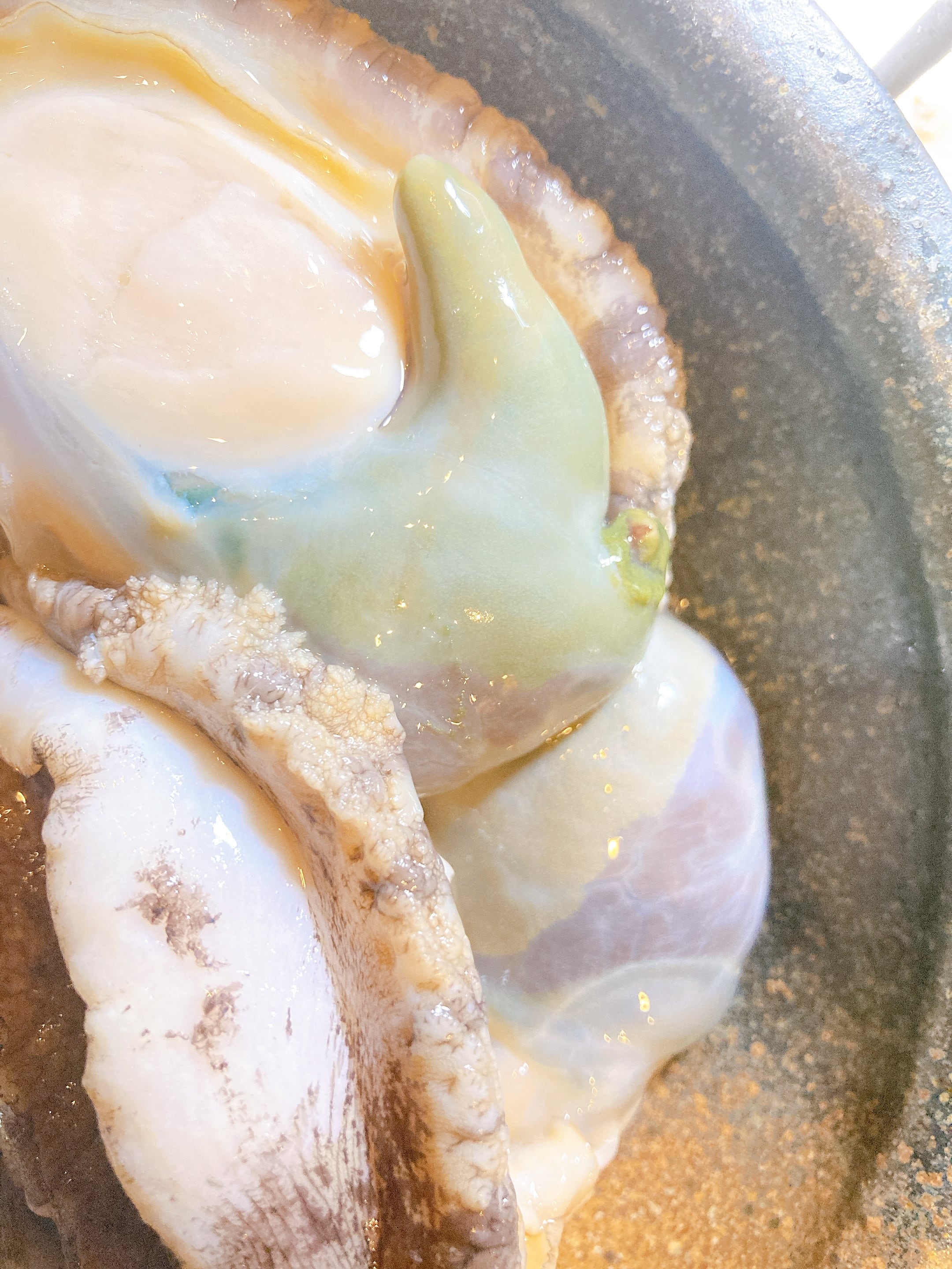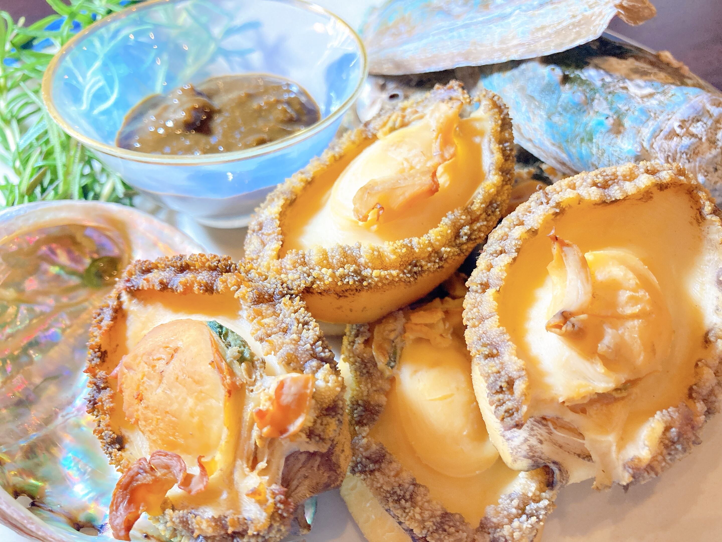 殻付きで、約100gのアワビを30gになるまで、凝縮させております。濃厚になり、燻製の薫りが乗ったアワビをお召し上がり下さい。